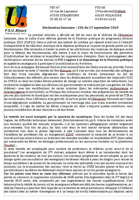 Vous êtes ici : Accueil Publications et Communiqués Déclarations liminaires - CR d’instances Déclaration liminaire de la FSU lors du CTA du 27/09/2018 30 septembre 2018 Publications et Communiqués Déclaration liminaire de la FSU lors du CTA du 27/09/2018 Imprimer l'article Vous pouvez lire les positions de la FSU Alsace en ouverture du Comité Technique Académique (CTA) du 27 septembre 2018 en cliquant sur le document ci-dessous.
