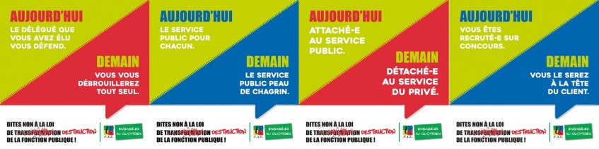 | 2 | « institue, dans les trois versants de la fonction publique, une instance unique pour débattre des sujets d’intérêt collectif – le comité social d’administration, territorial ou d’établissement - issu de la fusion des comités techniques (CT) et des comités d’hygiène, de sécurité et de conditions de travail (CHSCT) actuels » | Entrainera une baisse du nombre de représentants des personnels face à l’administration alors que les compétences de ces instances (CHSCT et CT) sont très différentes |