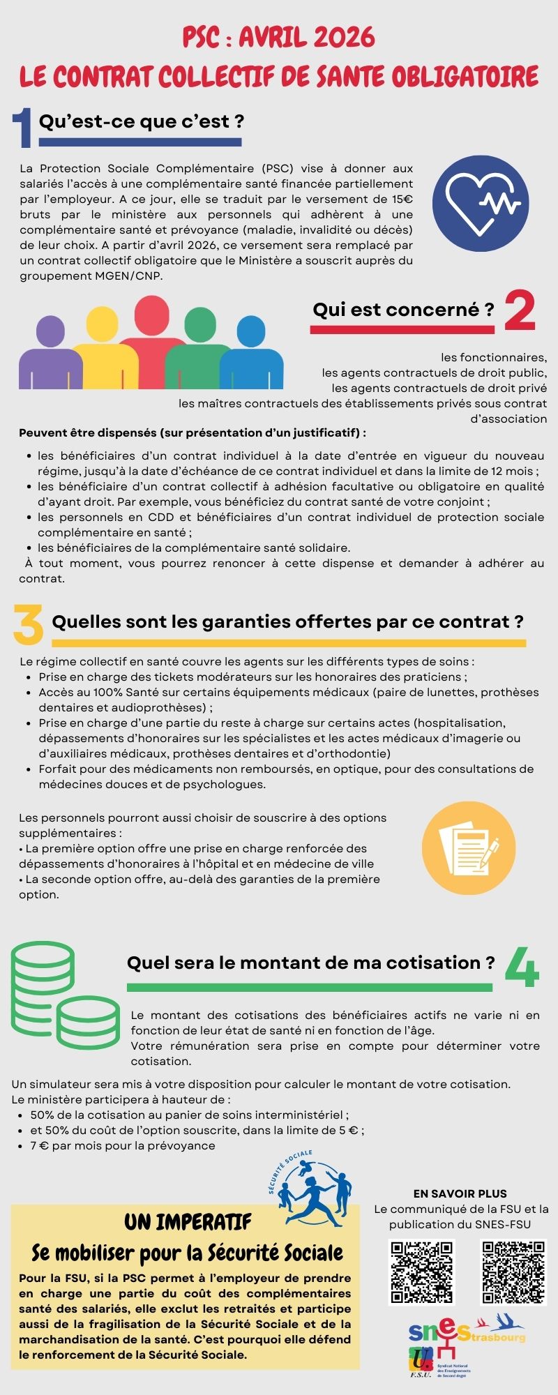 Vous êtes ici : Accueil Santé, conditions de travail, action sociale Congés maladie, problèmes de santé PSC - Avril 2026 : Le contrat collectif de santé obligatoire 24 avril 2025 Santé, conditions de travail, action sociale PSC - Avril 2026 : Le contrat collectif de santé obligatoire Imprimer l'article Vous pouvez cliquer sur l’image ci-dessous pour l’enregistrer et agrandir le texte.