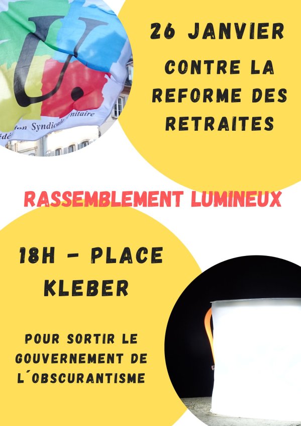 Vous êtes ici : Accueil Actualités Mobilisations Retraites : Rassemblement lumineux, place Kléber, le 26 janvier 22 janvier 2023 Actualités Retraites : Rassemblement lumineux, place Kléber, le 26 janvier Imprimer l'article En attendant la grande manifestation du 31 janvier, restons mobilisé·es : RASSEMBLEMENT lumineux à 18h place Kléber (Strasbourg) à l’appel de l’intersyndicale.