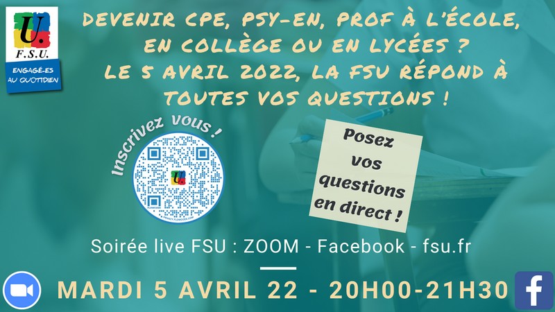 Les militant-es des syndicats de la FSU répondront à toutes vos questions sur les conditions d’inscription et de préparation, la formation avant et après les concours, l’affectation comme fonctionnaire stagiaire et sur le premier poste, votre future carrière..